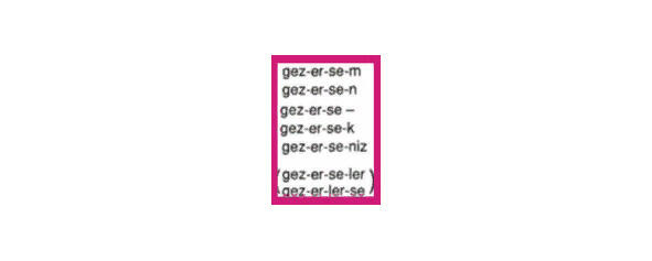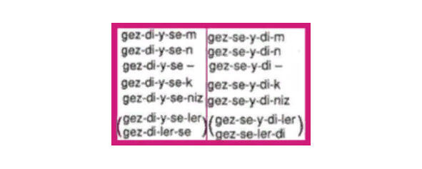 Alışveriş.. (направительный падеж) gitmek.. (будущее субъективное время) gibi durmak.. (настоящее продолженное время) (похоже, мы пойдём по магазинам), Beale (Беале).