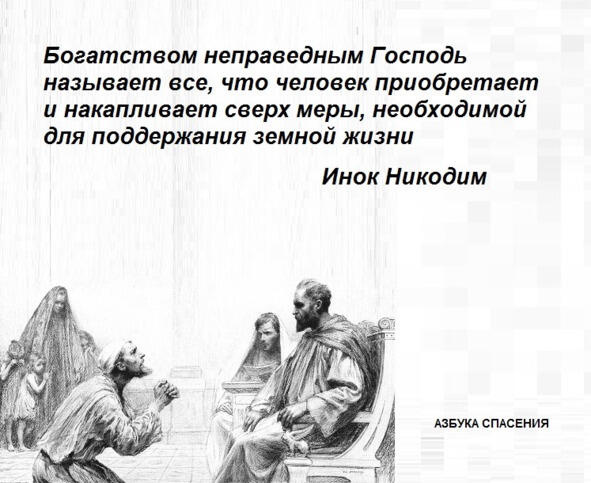 Богатством неправедным Господь называет все, что человек приобретает сверх меры, необходимой для поддержания земной жизни. Т. е. Он заповедует не отдавать последнее, но не накапливать излишнее, но раздавать бедным и прощать долги. Потому что все материальное недолговечно и подлежит, как и само тело человека, тлению и уничтожению временем. Как и Адаму сказал после его грехопадения: