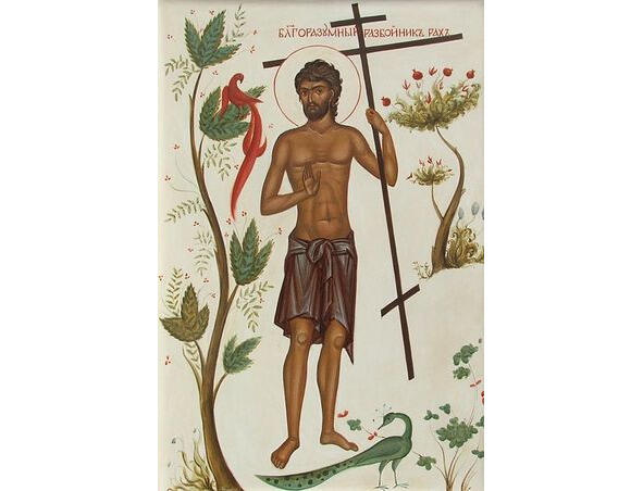 Когда в Страстную пятницу Христос был распят на Голгофе, вместе с Ним схватили и казнили двух разбойников. Так исполнилось пророчество, гласящее, что Мессия к злодеям причтен был (Ис. 53:12). Их распяли: одного по правую сторону от Христа, другого по левую. Перед смертью один из них, чье сердце ожесточилось от греха, оскорбил Господа, сказав: Если Ты Мессия, спаси Себя и нас! Но другой, тронутый состраданием при виде осужденного Праведника и охваченный раскаянием, строго прервал его: Или ты не боишься Бога, когда и сам осужден на то же? И мы осуждены справедливо, потому что достойное по делам нашим приняли, а Он ничего худого не сделал. И обращаясь ко Христу, произнес: Помяни меня, Господи, когда придешь в Царствие Твое! Господь ответил: Истинно говорю тебе, ныне же будешь со Мною в раю (Лк. 23: 3943).