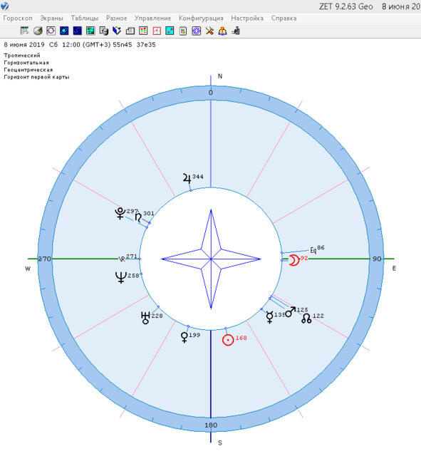 После запуска программы вводим исходные данные, в нашем примере это 08 июня 2019 года 12:00 мск. времени +03:00 GMT) и в разделе Конфигурации выбираем» local Space».
