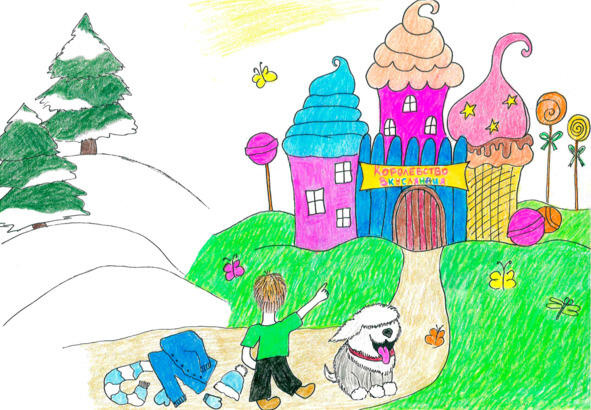 Мой верный друг всё бежал и бежал без устали, а я уже не узнавал ничего вокруг. Мы отъехали очень далеко от дома. Внезапно Феликс резко затормозил, я даже перелетел через него. «Ай, больно!» Я медленно встал, отряхивая одежду от снега и попутно ругая Феликса. Что же его остановило? Поднимаю глаза, и у меня перехватило дыхание. Передо мной было такое, такое просто не передать словами. Я даже сначала не поверил своим глазам. Может, это сон? Жаль, что у Феликса нет пальцев, чтобы ущипнуть меня. Мой друг тоже стоял, как вкопанный. Перед нами предстал другой мир, который непонятно откуда взялся, будто бы вырос из-под земли! Он был такой удивительный и не похожий на реальность, что мы продолжали глазеть, не моргая, раскрыв рты. Первое, что привело меня в удивление, это время года. У нас же во дворе зима, а здесь лето! Удивительно, но факт! Как это возможно? Наверное, это сон! Зайдя за границу, мы убедились, что это реальность: тут ЛЕТО! Бабочки летают. Недолго думая, я снял куртку, а затем остальную тёплую одежду. Жара! В воздухе, наверное, было +30 градусов. Мне очень захотелось пить. Феликс вяло вилял хвостом, не отходя от меня ни на шаг. Видимо, он тоже не отказался бы от миски воды.