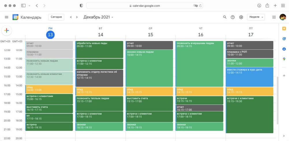 В зеленых ячейках календаря задачи, которые ведут к продажам: звонки, встречи, счета, коммерческие предложения и так далее