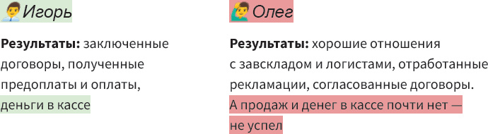 Результат это продукт продавца то, что в итоге он должен создавать для компании. Игорь создает единственный продукт деньги в кассе, а Олег кучу разных и вроде полезных, но вот только среди этих продуктов совсем мало главного продаж и оплат.