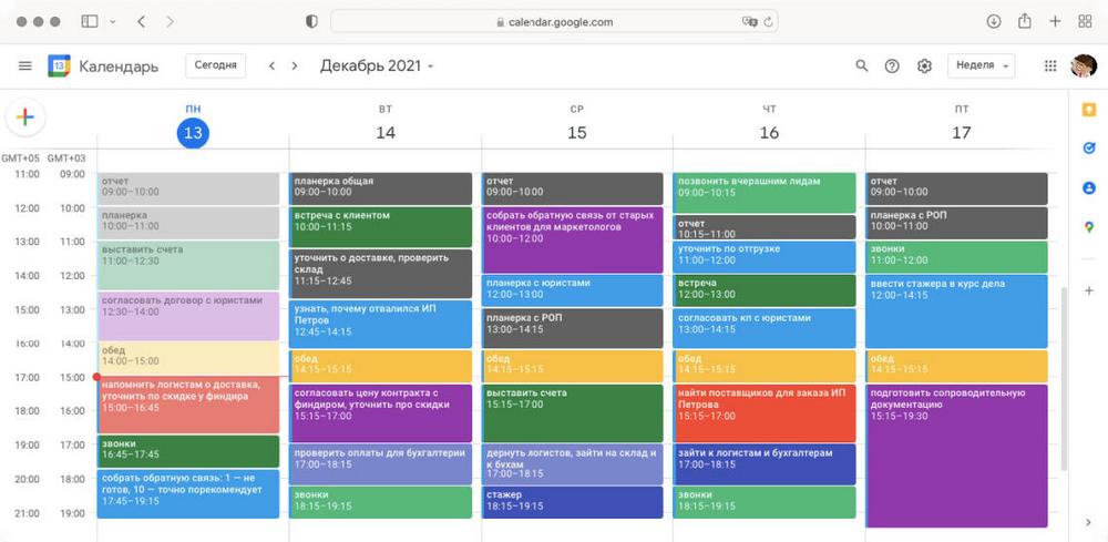По календарю видно, что продавец всё время занят: каждый день и час его жизни расписаны, он постоянно контролирует отдел доставки, собирает обратную связь с клиентов, готовит договоры, общается с бухгалтерией и другими отделами.