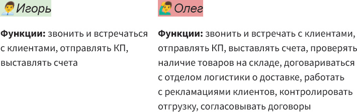 Из-за лишних функций продавцы не успевают продавать. Представьте двух продавцов Игоря и Олега. Игорь занимается только продажами, а Олег всем подряд. Под продавать мы здесь имеем в виду те действия, что ведут клиента к сделке: звонки, встречи, коммерческие предложения, отправка счетов на оплату.