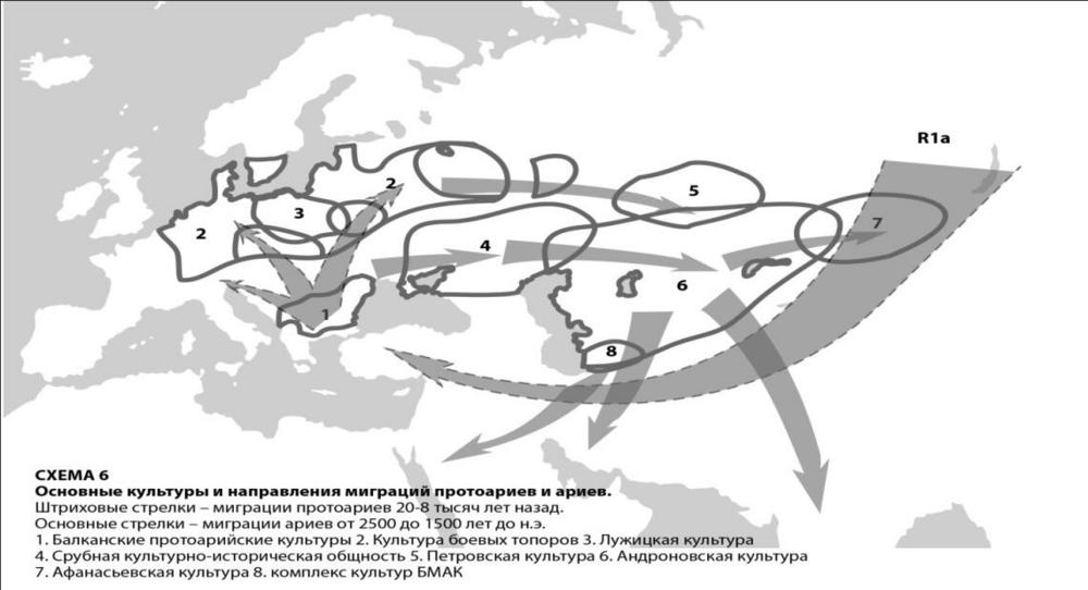 К IV-му тысячелетию до н.э. потомки сибирских мигрантов рода R1a широко распространились по всей северной части Европы от предгорьев Альп до юга Скандинавии и по широте от берегов Северного моря до верховьев Волги. Группу археологических культур, образованных ими, принято называть культурно-историческим сообществом (КИО) культуры шнуровой керамики-боевых топоров (по обычаю сопровождать покойного в захоронении каменным топором ладьевидной формы) в дальнейшем КШК 2 на схеме 6. КИО боевых топоров не только была крупнейшим подобным догосударственным образованием древних племен всех эпох, но и существовала также рекордно долго более тысячи лет. По эпохам это конец энеолита начало бронзового века.