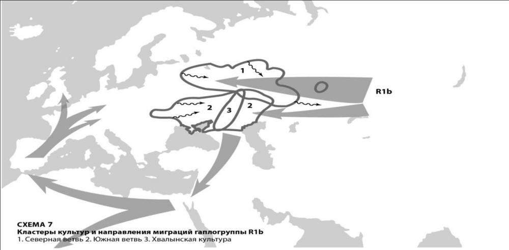 На схеме 7 показаны направления основных миграций из Сибири племен гаплогруппы R1b (эрбинов), начиная еще с каменного века, и основанная ими в Европе культура колоколовидных кубков (ККК), которая расширялась от мест высадки первых отрядов завоевателей на Иберийском (Пиренейском) полуострове примерно 2800 лет назад в сторону севера и северо-востока. Расширялась, пока не уперлась в сопротивление протоариев КИО боевых топоров на территории Восточной Германии. Тогда же в конце II-го тысячелетия до н.э. состоялась известная, первая в истории, массовая битва народов битва на реке Толлензе (есть в любом поисковике). Эрбины, продолжая завоевание Европы, начали тогда свой первый «дранг нах остен», сотни воинов сошлись в кровавой схватке Клесов по особенностям расположения останков погибших и анализу их гаплогрупп сделал вывод, что, раз эрбины были брошены в болото, а арии захоронены со своими топорами, то победителями были они.