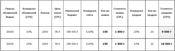 Если повысить конверсию продаж на 10%, то цена сделки уменьшится в 2 раза. Если из 100 заявок вы заключали раньше 10 сделок, а теперь станете заключать 20, то стоимость сделки и расход на привлечение 1-го клиента уменьшаться в 2 раза.