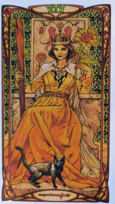 На троне сидит уверенная в себе королева. В правой руке у нее жезл, в левой подсолнух.