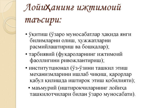 Олинган таҳлил материаллари, амалга оширилгандан сўнг, жамиятнинг эҳтиёжларини қондирадиган ва яшаш учун максимал қулайликни таъминлайдиган меъморий тузилишга эга бўлиш керак.