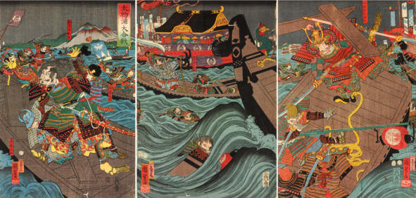 Триптих. Великая битва у Данноура. Последнее сражение между кланами Тайра и Минамото в 1185 году. Утагава Куниеси (1856). Коллекция Британского музея. Общественное достояние. Источник заимствования ресурсы мировой Сети