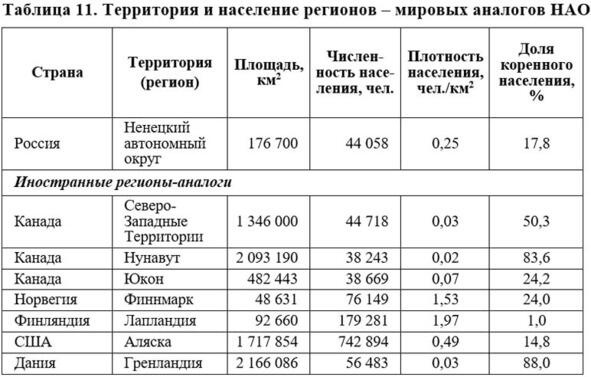 Таким образом, Ненецкий автономный округ столь же урбанизированная территория, как и норвежский Финнмарк, а по концентрации населения в одном центре наиболее близкий аналог округа Северо-Западные территории Канады.