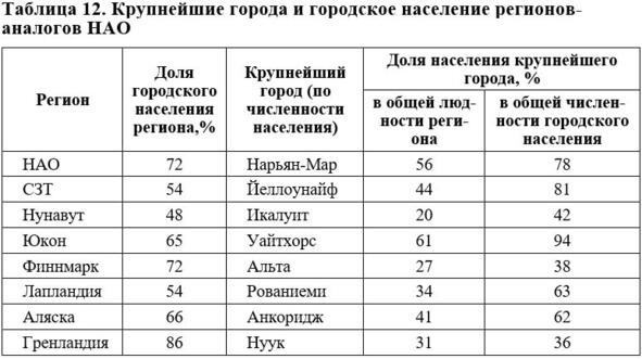 Доля городского населения НАО составляет 72% столько же, сколько в норвежском Финнмарке (табл. 12). При этом в крупнейшем городе округа проживает свыше половины всех жителей региона, в то время как в норвежской Альте только чуть более четверти. По доле крупнейшего центра в общей людности округа НАО уступает только Юкону. Более урбанизированной, чем НАО, является территория Гренландии правда, здесь нужно учесть особенности статистического учета: городским поселением в Гренландии вполне может считаться поселок с населением в 200 человек.