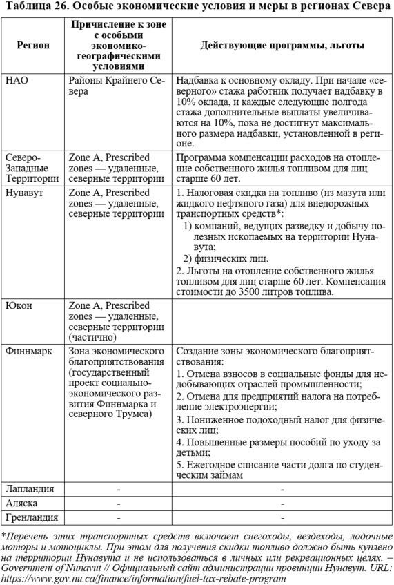 Ненецкий автономный округ входит в перечень районов Крайнего Севера Российской Федерации. В связи с этим, для населения НАО российским законодательством предусматриваются определенные льготы. Аналогичным образом особые экономические условия предоставляются в провинциях Канады и Финнмарке (табл. 26).