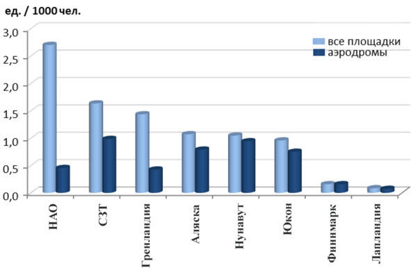 По числу аэродромов на душу населения НАО занимает пятое место. Лидер Северо-Западные Территории, Нунавут и Аляска занимают второе и третье места соответственно (рис. 26). Лапландия и Финнмарк, где авиационный транспорт не играет определяющей роли, демонстрируют наименьшую обеспеченность своих жителей аэропортами.