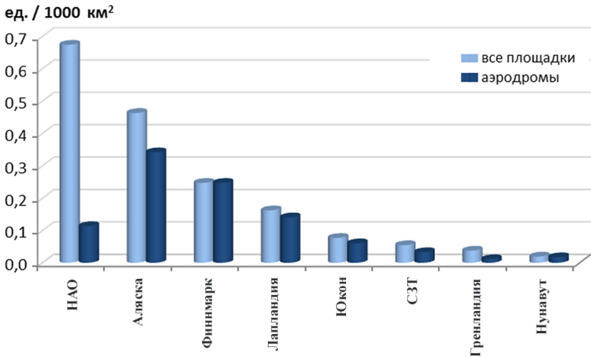 Рис. 25. Обеспеченность площадками воздушного транспорта регионов мировых аналогов НАО (на единицу площади)