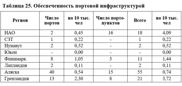 Роль водного транспорта наиболее заметна в регионах с протяженной и освоенной береговой линией. По обеспеченности портами на единицу людности НАО уступает Гренландии, Финнмарку и Аляске, а по общему числу всех морских и речных портопунктов занимает 1-е место (табл. 25).