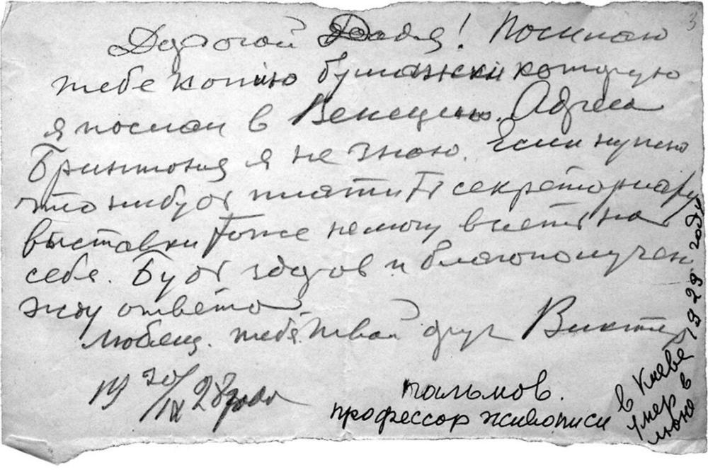 Дорогой Додя! Посылаю тебе копию бумажки, которую я посылал <посылаю?> в Венецию. Адреса <выставкома?> я не знаю. Если нужно что-нибудь платить секретариату выставки, тоже не могу взять на себя. Будь здоров и благополучен. Жду ответа.