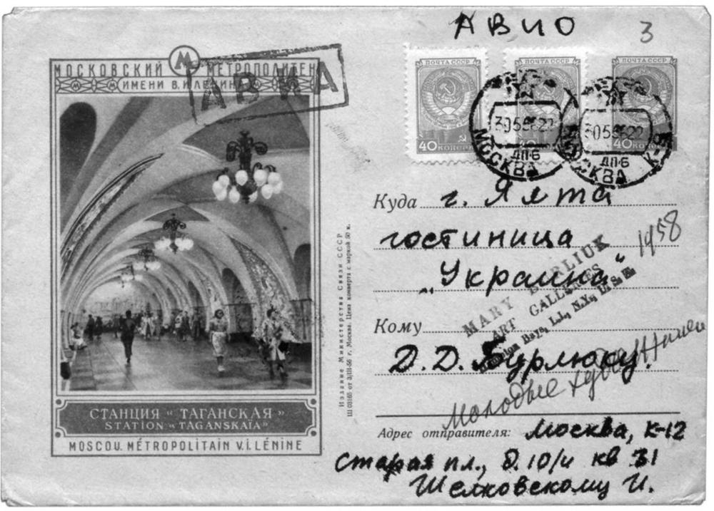 С уважением Наташа Касаткина, Володя Слепян, Игорь Шелковский45.Конверт письма, написанного Игорем Шелковским от молодых художников Бурлюкам в Ялту. 1956
