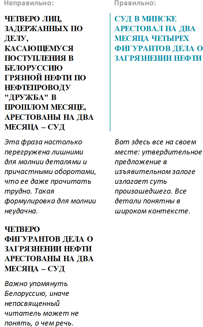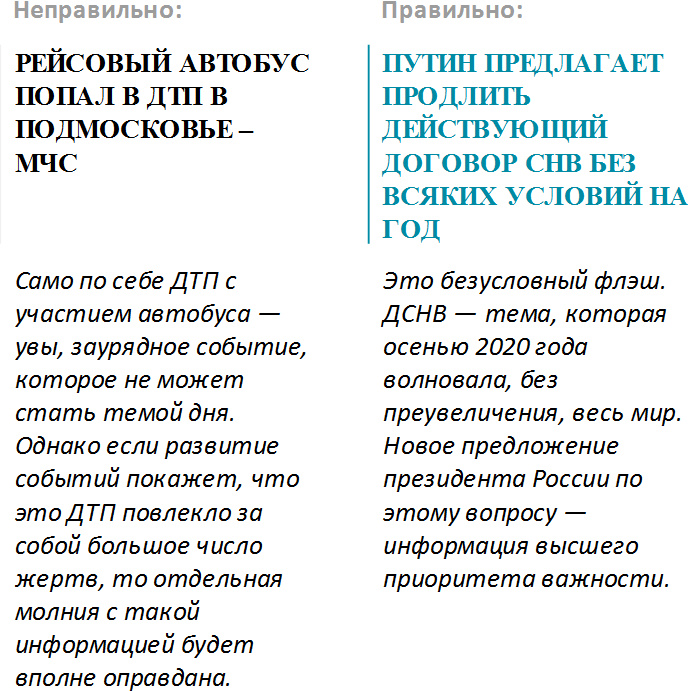 Молния должна быть корректно сформулированаМолния должна донести важнейшую информацию до подписчика быстро, коротко и ясно, но при этом ни в коем случае нельзя искажать смысл. Такой риск всегда существует, поэтому при передаче молний надо быть очень внимательным к формулировкам.
