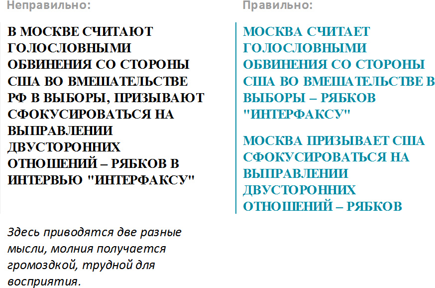 Лучше всего давать молнии в форме простых тезисов, но иногда нельзя обойтись без более сложных конструкций. Бывает, например, что высказывание ньюсмейкера звучит слишком неконкретно и не несет особой смысловой нагрузки без упоминания конкретного информационного повода.