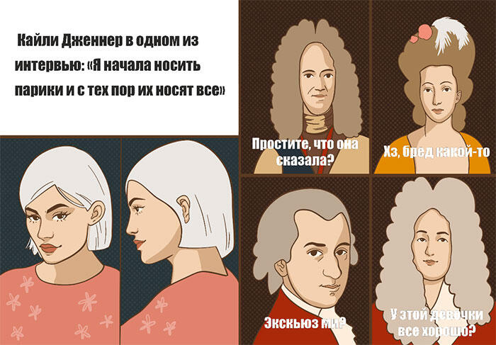 Вообще парик аксессуар с долгой историей. Жители Древнего Египта из-за жары сбривали волосы на голове, причём как мужчины, так и женщины. Чтобы защититься от солнечного удара, все они носили парики. Кто победнее из перьев или гривы лошадей, а фараоны и их вельможи щеголяли в париках из настоящих человеческих волос. Впоследствии парик стал не только необходимостью, но и демонстрацией статуса и частью моды, которая распространилась на Персию и Древнюю Грецию. О Мессалине, жене одного из императоров Древней Греции, известной распутным поведением, даже написаны такие строки: «Блудная эта Августа бежала от спящего мужа; / Чёрные волосы скрыв под парик белокурый»[9]. Светлые парики из немецких волос чаще носили женщины лёгкого поведения.