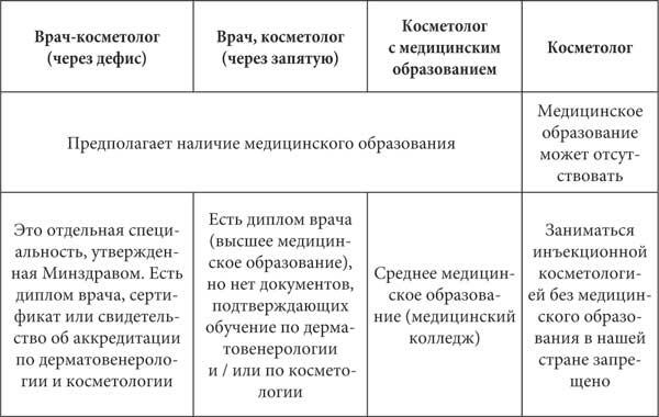 Давайте подытожим: «Врач-косметолог» (через дефис), «врач, косметолог» (через запятую), «косметолог с медицинским образованием» все, кто называют себя таким образом, имеют медицинское образование только совершенно разное (см. табл. 1, с. 22). Есть еще группа «косметологов», самая интересная. Они вот так, собственно, и называются в одно слово. К ним, на мой взгляд, должно быть больше всего вопросов, потому что эти люди, скорее всего, не имеют вообще никакого медицинского образования. У людей старшего поколения слово «косметолог», как правило, вообще не ассоциируется с медицинским образованием. Косметологом им видится тот, кто работает в парикмахерской или делает брови и парафиновые маски для рук.