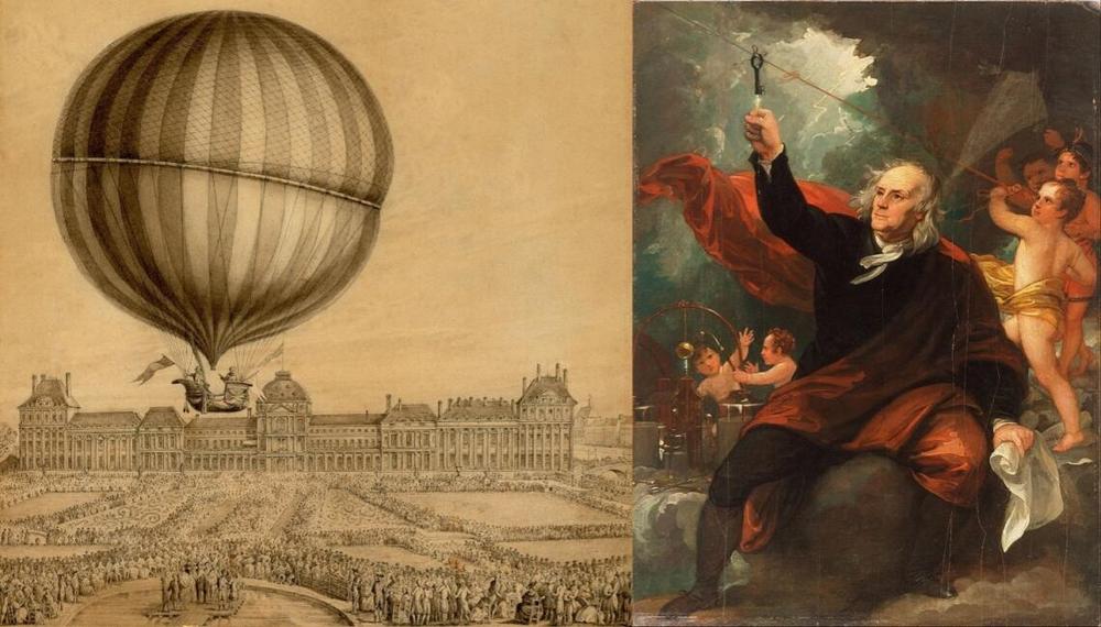 Современная иллюстрация первого полета профессора Жака Шарля с Николя-Луи Робером, 1 декабря 1783 года. Вид с площади Согласия на дворец Тюильри (разрушен в 1871 году) и Бенджамин Франклин, берущий электричество с неба, художественное воплощение эксперимента Франклина с воздушным змеем, нарисованного Бенджамином Уэстом около 1816 года.