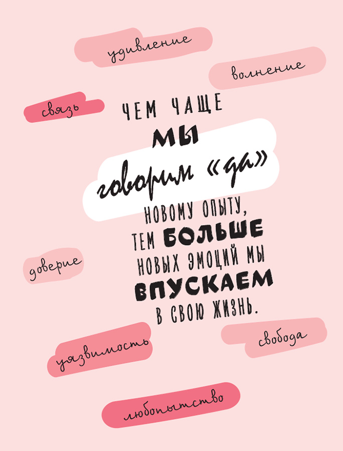 Раньше, когда я испытывала страх, я чувствовала, что приближается нечто плохое. Теперь я понимаю, что чувство страха может быть предвестником роста, прогресса и новых возможностей. Я обнаружила, что чем чаще мы говорим «да» новым переживаниям, тем больше новых эмоций мы впускаем в свою жизнь. Удивление, свобода, любопытство, уязвимость, волнение, доверие и связь вот несколько эмоций, которые я практически не испытывала в своей «прошлой» жизни. Раньше в моей голове было столько страха, что я не оставляла места для других эмоций.