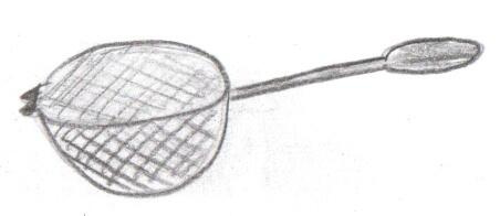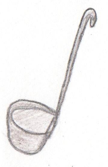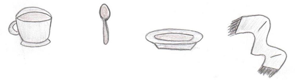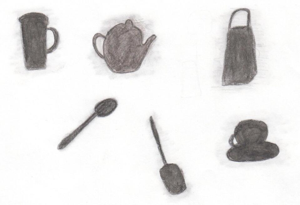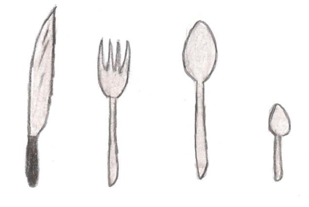 * На картинке: нож, вилка, ложка, чайная ложка, тарелка, половник, стакан, кружка, чашка с блюдцем, чайник, сковорода, заварочный чайник, кастрюля, сито, солонка, сахарница, терка.