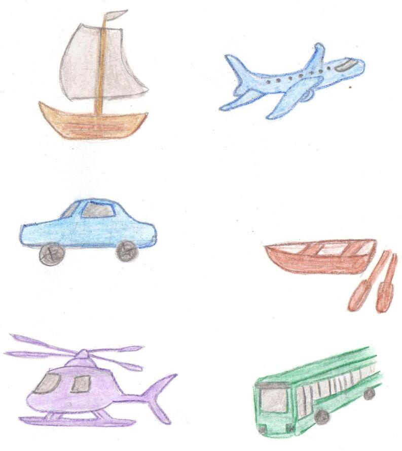 *На картинках: автомобиль, мотоцикл, автобус, грузовик, велосипед, самолет, корабль, вертолет, трамвай, поезд, трактор, лодка.
