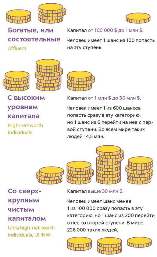 Люди, которые просто много зарабатывают или живут в дорогостоящих домах и квартирах, к этим градациям не относятся. В расчет берется только капитал. И нам с вами предстоит поговорить о различиях в этих понятиях уже в следующей главе.