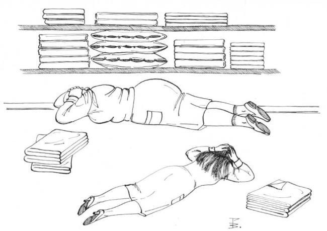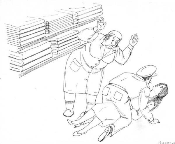 Весь факультет хорошо знал, что баталерка для Марии Михайловны являлась святым местом, дверь в нее она никогда открытой не держала. Даже, уходя на пять минут, и оставляя в помещении Аню, строгая баталерная начальница дверь закрывала на замок. Заглянув в дверь, мичман увидел ужасную картину посредине комнаты ничком лежала Анна. Решив, что произошла ужасная трагедия, старшина бросился к ней, перевернул девушку на спину и начал расстегивать блузку, чтобы оказать первую помощь. Анюта, не открывая глаз, пыталась сопротивляться. Мичману показалось, что у девушки начались конвульсии и он, оседлав ее, начал делать искусственное дыхание рот в рот. В это время, не слыша больше выстрелов, Мария Михайловна выползла из под стеллажа. Увидев, что на ее помощнице сидит мичман, она воскликнула: