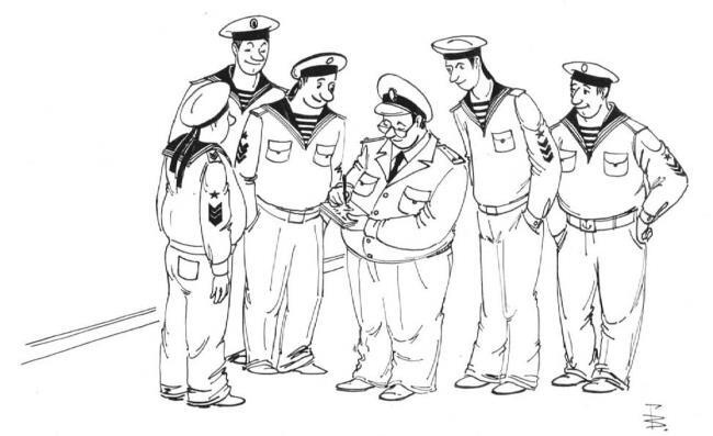 Обнаружив замечание, капитан 3 ранга выгонял из строя увольняющегося и тот шел, яко бы, устранять замечание. На самом же деле курсант прятался и ждал, когда закончится экзекуция. Наконец Аркадий Алексеевич, закончив осмотр, приказывал дежурному вести увольняющихся на проходную. Дежурный по роте, уже изрядно устав от такой длительной проверки, командовал: Увольняющиеся, равняйся, смирно. Но поскольку после проверки в строю оказывалось не более двух трех человек, равняться было некому. Командир роты оглядывал строй и удивленно спрашивал: