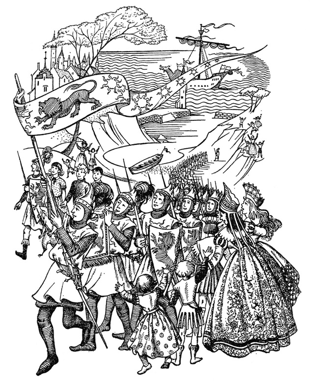 В те времена жизнь на островах текла медленно, неторопливо, поэтому сначала открылась лишь небольшая дверца, вышел взъерошенный парень в видавшей виды грязной шляпе вместо шлема, со ржавым копьём в руке, и удивлённо заморгал, увидев перед воротами огромную толпу.