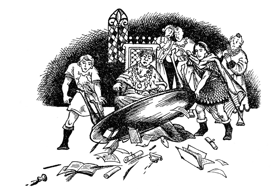 Сначала Каспиана приветствовали только те, кого предупредил посланец Берна: кто знал, что произошло, и радовался этому, но затем к ним присоединились все ребятишки им просто нравилась процессия, да и видеть таких не доводилось. Не остались в стороне и школьники, и не только потому, что им тоже нравилась процессия: они понимали, что чем больше шума и суматохи, тем меньше вероятность, что придётся сидеть этим утром на уроках. Следом высунулись из дверей и окон старухи и принялись переговариваться, радуясь появлению короля, ведь что такое губернатор по сравнению с его величеством? По той же причине присоединились к толпе молодые женщины и девушки. Не последнюю роль сыграло и то, что Каспиан и Дриниан, да и все остальные, были хороши собой. Их примеру последовали и молодые люди: подошли поближе, чтобы посмотреть, на кого это они любуются. Таким образом, к тому моменту, когда Каспиан дошёл до ворот замка, приветствовать его собрались почти все горожане. Сидевший в замке Гумп, с трудом разбираясь со счетами, бланками, приказами и уставами, вдруг услышал шум.