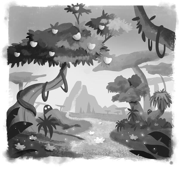 Девочка заметила крошечный пушистый розовый шарик, свисавший с ближайшей лианы. Пока она смотрела, шар начал расти прямо у неё на глазах! Спустя несколько секунд он превратился в идеальный спелый плод и выглядел как персик, но почему-то пах малиной. Азмина не удержалась и откусила кусочек. К её удивлению, на вкус плод был точь-в-точь как шоколад!