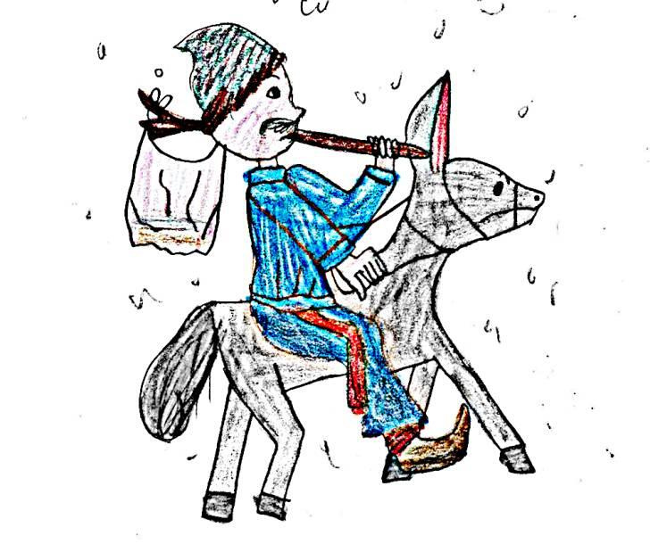 А Назар тую ряднину в´яже на жердину; уламок ржавої шаблюки при боці почепив; в сусіди вислюка поцупив, сів і з села потріхкотив.
