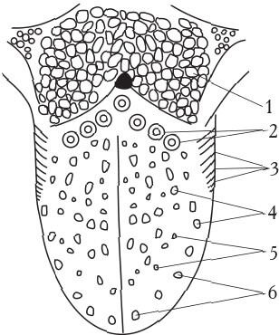 Рисунок 1. Сосочки языка: 1 язычная миндалина; 2 желобовидные сосочки; 3 листовидные сосочки по краю языка; 4 конические сосочки на спинке языка; 5 нитевидные сосочки; 6 грибовидные сосочки по краю языка