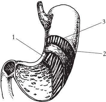 Рисунок 3. Мышечные слои желудка: 1 косой (внутренний); 2 циркулярный (средний); 3 продольный (наружный)