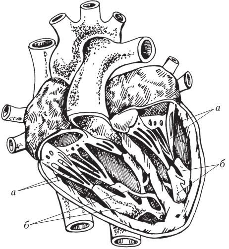 Рисунок 5. Внутреннее строение камер сердца: а сухожильные хорды, б сосочковые мышцы