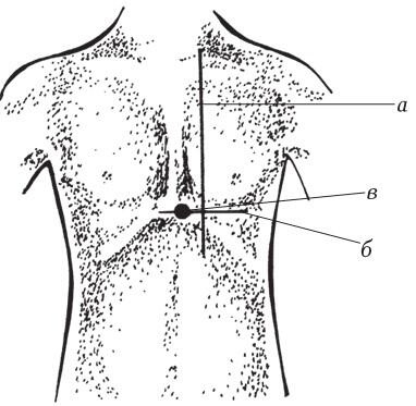 а срединно-ключичная линия, б линия, проходящая через пятое межреберье, в зона расположения верхушечного толчка