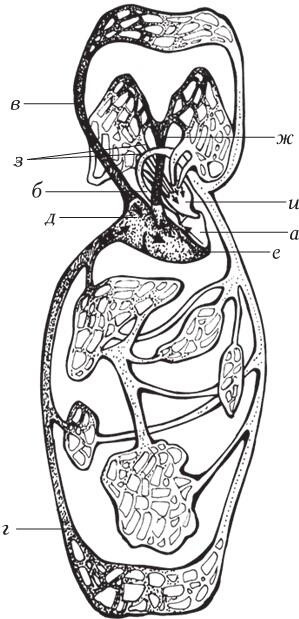 Рисунок 8. Схема большого и малого кругов кровообращения: а левый желудочек, б аорта, в верхняя полая вена, г нижняя полая вена, д правое предсердие, е правый желудочек, ж легочная артерия, з легочные вены, и левое предсердие