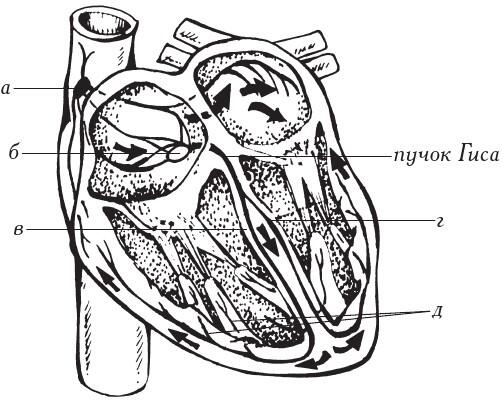 Рисунок 9. Строение проводящей системы сердца: а сино-атриальный (синусовый) узел, б атрио-вентрикулярный узел, в правая ножка пучка Гиса, г левая ножка пучка Гиса, д волокна Пуркинье