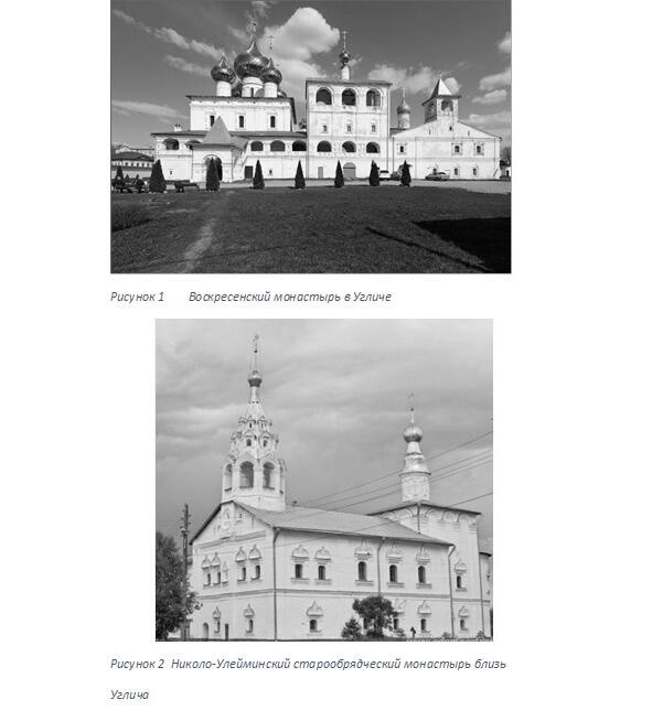 Семнадцатый век оставил в Угличе несколько выдающихся творений архитектуры. Среди них Воскресенский монастырь. В течение 16741677 годов был воздвигнут грандиозный монастырь, реализовавший идею монастыря-города. Ансамбль включает большой Воскресенский собор с двумя приделами, трёхпролётную звонницу с церковью Марии Египетской, трапезную палату с церковью Одигитрии. Собор, звонница и трапезная с церковью, как бы вытянутые в одну стройную линию и составляющие неповторимый по красоте единый ансамбль удивительное творение русских зодчих. Современный этап истории обители начался в 1999 году, когда монастырь был передан Русской Православной церкви.