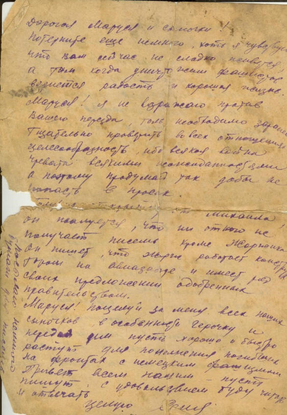 (Заметки на полях) Маруся! В письмо вложил справку, что находишься на моем иждивении, пять конвертов, открытку и синюю бумагу. Напиши получение. (Подпись).