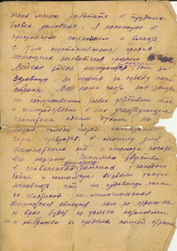 Я нахожусь в прекрасном, солнечном и вместе с тем ощетинившемся против немецких захватчиков грозном Кавказе. Сейчас здесь разгораются жестокие бои за Здравицу, за нефть, за судьбу нашей страны. Все наши части, как занятые по обслуживанию боевых действий, так и непосредственно в них участвующие, пропитаны одним духом: ни шагу назад, только вперед, Кавказские горы превратить в могилу для фашистских орд и отсюда начать его разгром. Чинимые зверства в захваченных фашистами районах у каждого бойца и командира вызвали такую ненависть, что ни чудовища-танки со свастикой, ни многочисленная фашистская авиация нам не страшны, и враг будет не только остановлен, но и отброшен за пределы нашей страны.