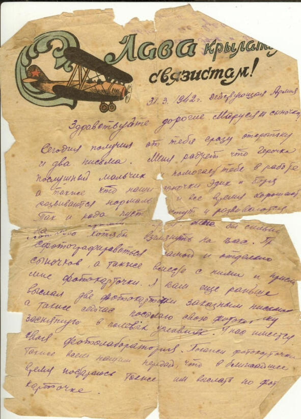 Сегодня получил от тебя сразу открытку и два письма. Меня радует, что Герочка послушный мальчик и помогает тебе в работе, а также, что наши сыночки Эдик и Боря развиваются нормально и всё время хорошеют. Так и надо, пусть растут и развиваются на зло врагам. Маруся! Мне бы сильно хотелось хотя бы взглянуть на Вас. Прошу сфотографироваться самой и отдельно сыночков, а также вместе с ними, и пришли мне фотокарточки. Я вам еще раньше выслал две фотокарточки заказным письмом, а также сейчас посылаю свою фотокарточку, заснятую в полевых условиях. У нас имеется своя фотолаборатория. Покажи фотокарточки также всем нашим. Передай, что в ближайшее время постараюсь также им выслать по фотокарточке.