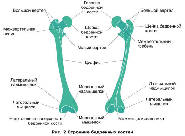 Найдите большой и малый вертел бедренной кости на рис. 2, проследите изгибы бедренной кости до ее дистальной (дальней) головки, имеющей два мыщелка, которая вместе с головкой большеберцовой кости образует коленный сустав.