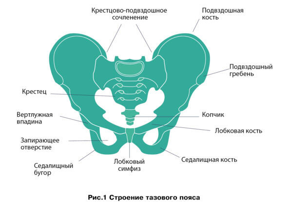 На рис. 1 впереди посредством соединения лонных костей (между которыми связка симфиз), а сзади через крестец, посредством двух крестцово-подвздошных суставов. Свободная нижняя конечность: бедренная кость + кости голени (большеберцовая и малоберцовая) + кости стопы.